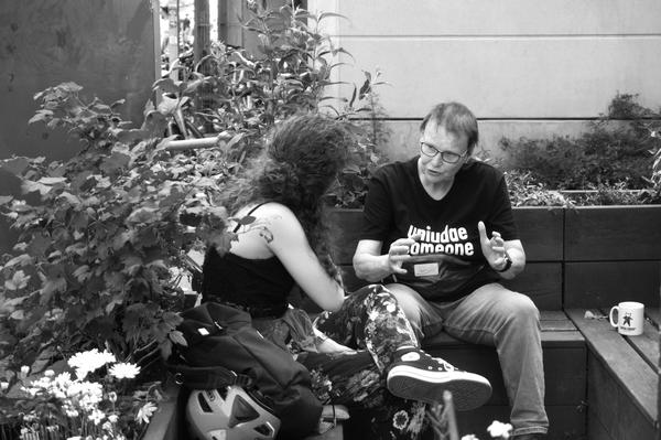 A Book and Reader speak at a Human Library Reading Garden event in Copenhagen Denmark on June 24, 2025.