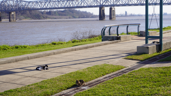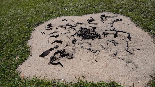 Manacles and chains representing the slave trade at Forks of the Road, a slave market in Natchez, Mississippi on March 11, 2025.